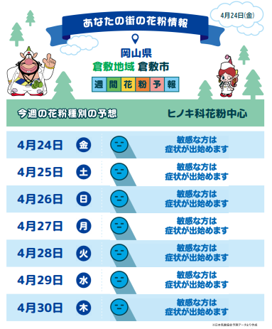 今週は肌寒いく、風の強い日が多かったため、鼻のコンディションが悪かった方も多いと多い思います。週末からは少し暖かくなるようです。花粉の飛散は少ない予報ですが、念のため外出の際には花粉対策を忘れずにお願いします。